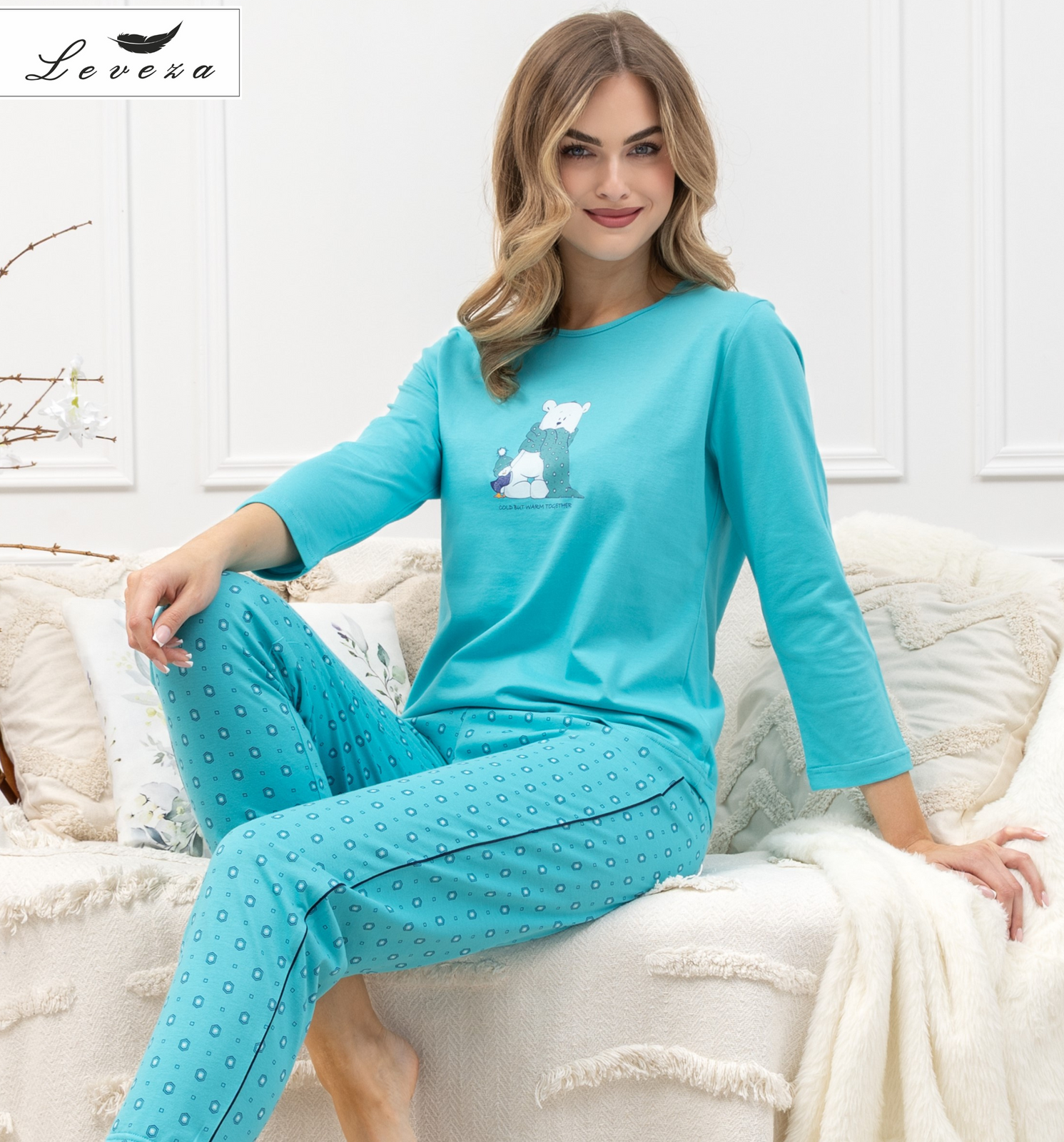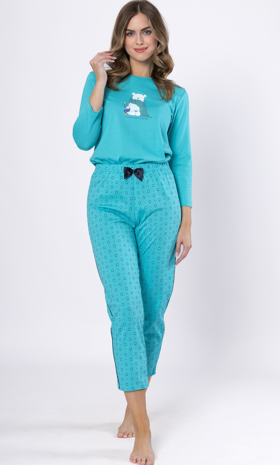 Bawełniana piżama damska. Bluzka z rękawem 7/8 oraz okrągłym dekoltem zdobiona nadrukiem misia na wysokości piersi. Spodnie długie, wzorzyste.