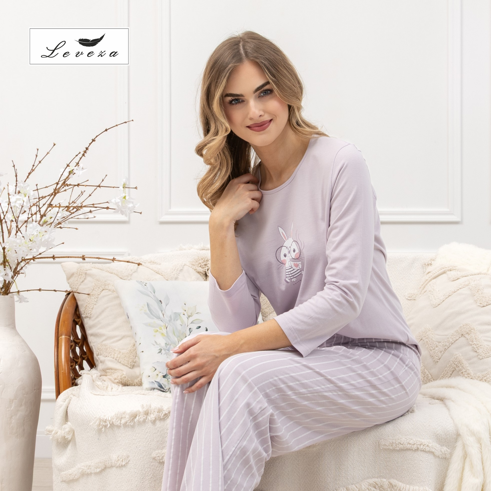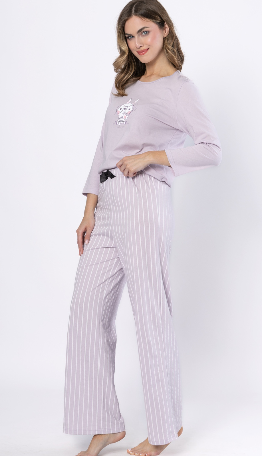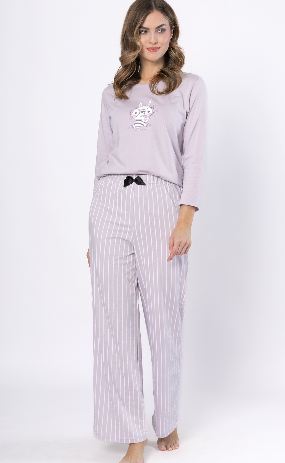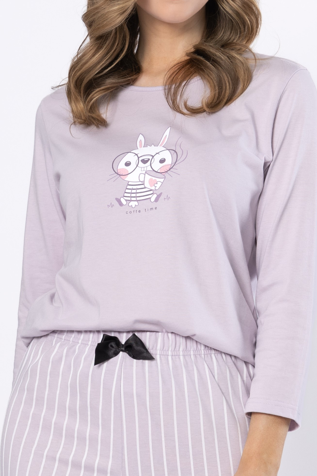 Bawełniana piżama damska. Liliowa bluzka z ozdobnym nadrukiem zajączka i rękawami 7/8. Spodnie w pionowe paski, z długą nogawką i ozdobną kokardą.