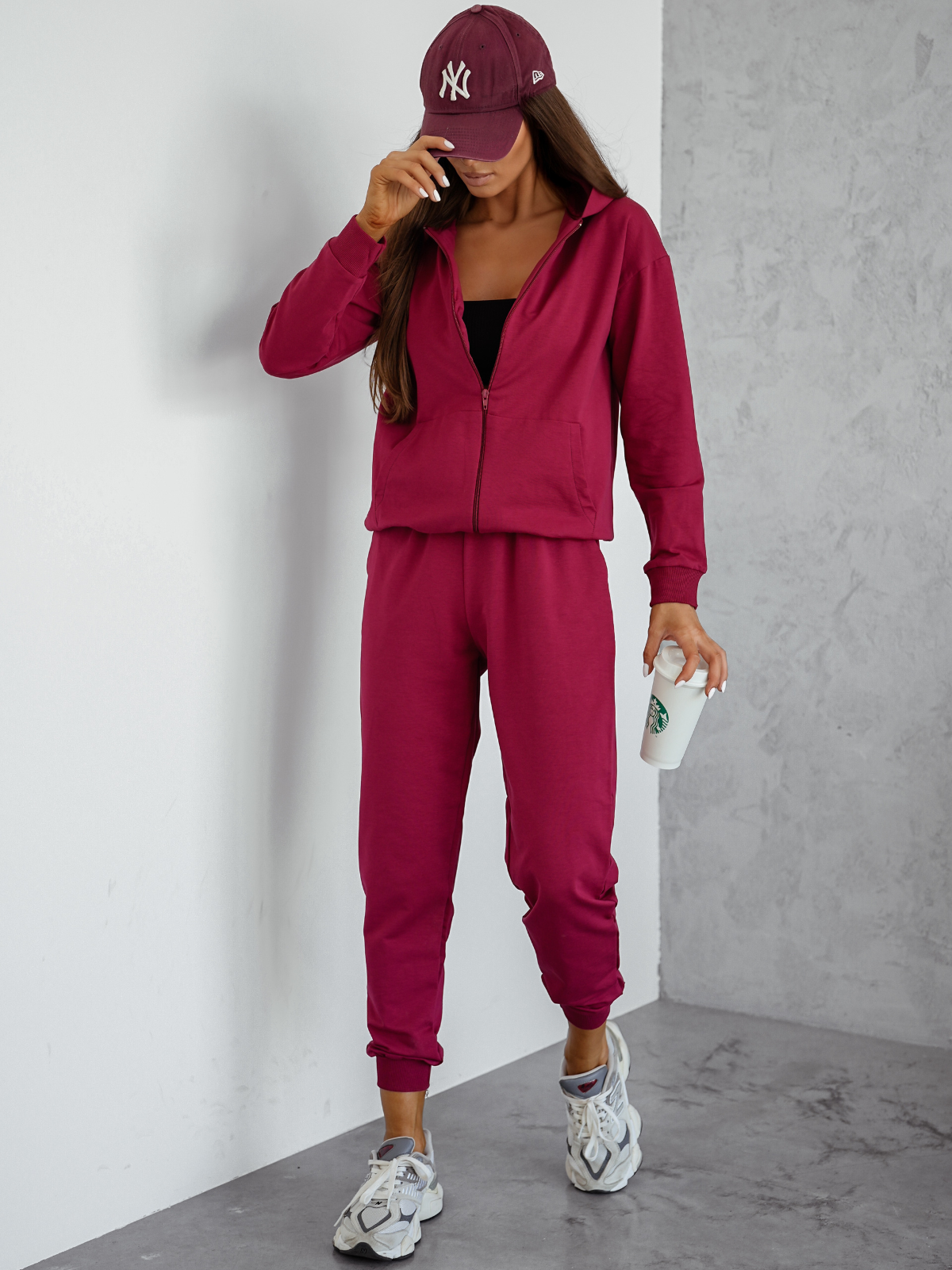 Damski komplet dresowy. Wykonany z wysokiej jakości bawełny. Bluza z kapturem, zapinana na zamek. Spodnie zwężane, zakończone ściągaczami, posiadają praktyczne kieszenie na wysokości bioder oraz wygodną gumkę w pasie.