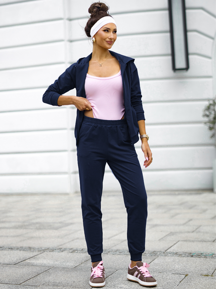 Damski komplet dresowy. Bluza z kapturem, zapinana na zamek. Spodnie zwężane, zakończone ściągaczami, posiadają praktyczne kieszenie na wysokości bioder oraz wygodną gumkę w pasie.