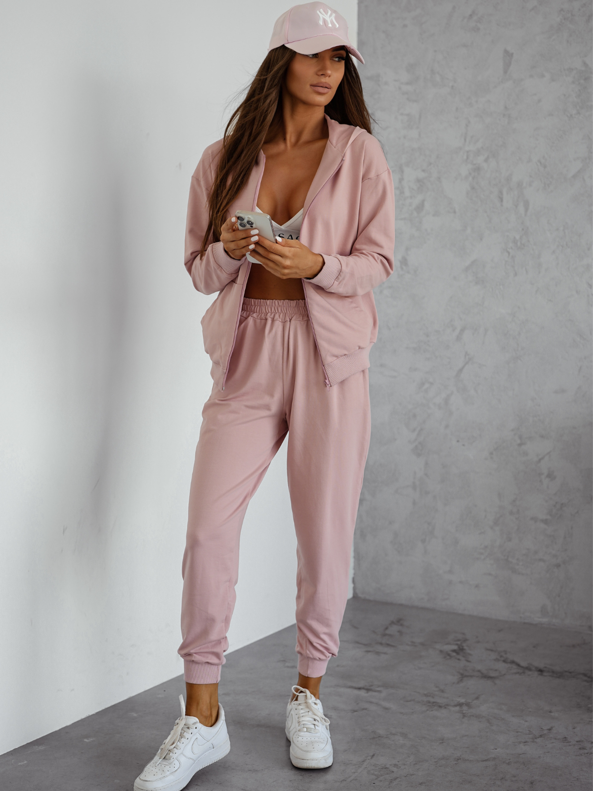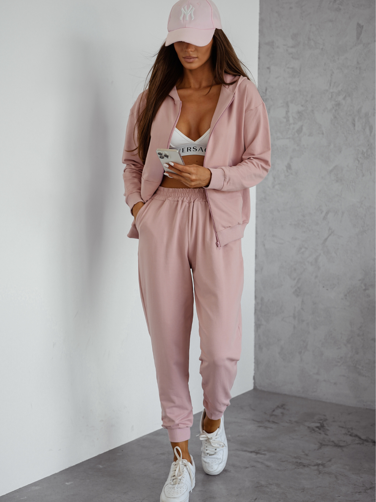 Damski komplet dresowy. Bluza z kapturem, zapinana na zamek. Spodnie zwężane, zakończone ściągaczami, posiadają praktyczne kieszenie na wysokości bioder oraz wygodną gumkę w pasie.