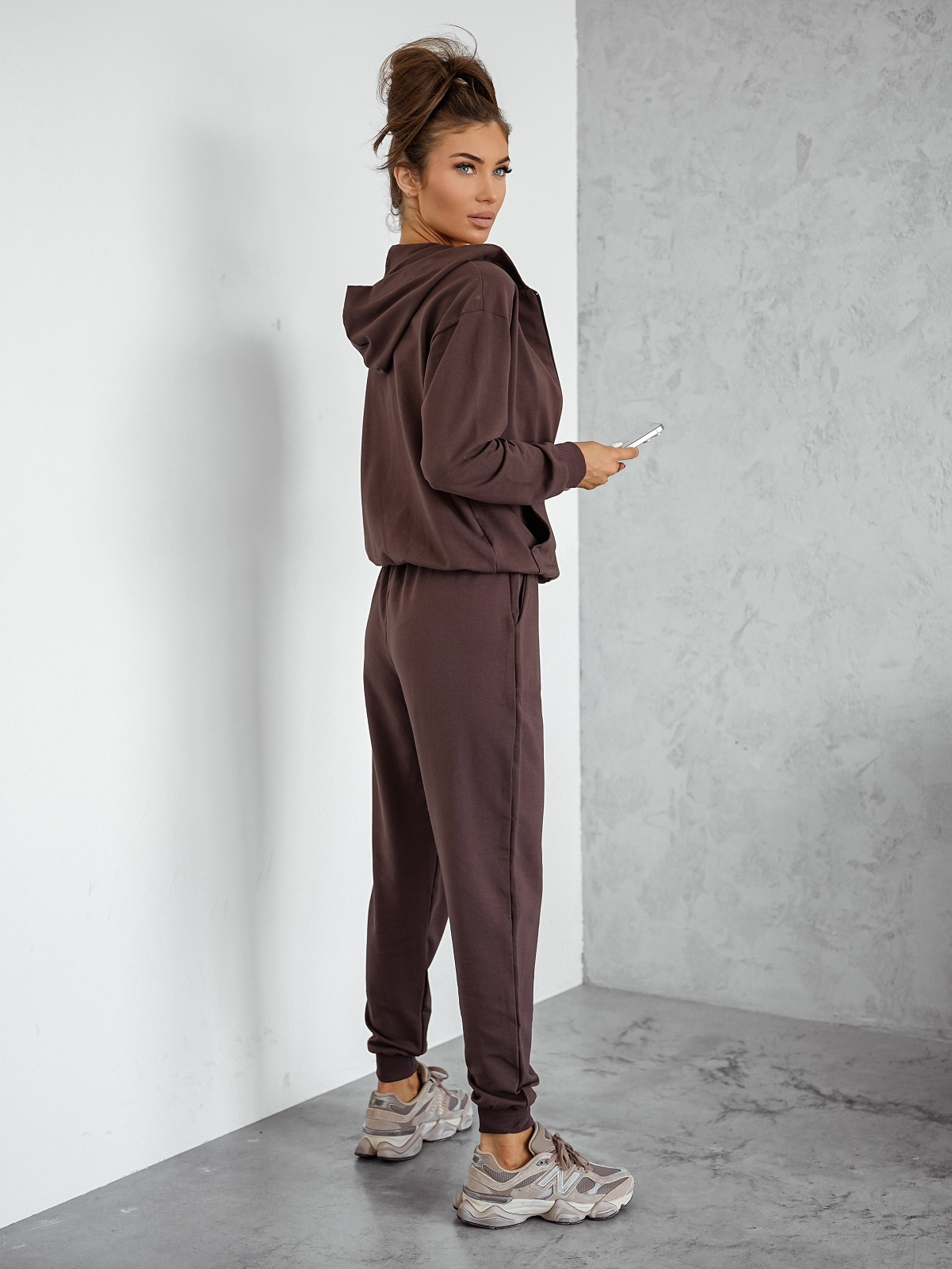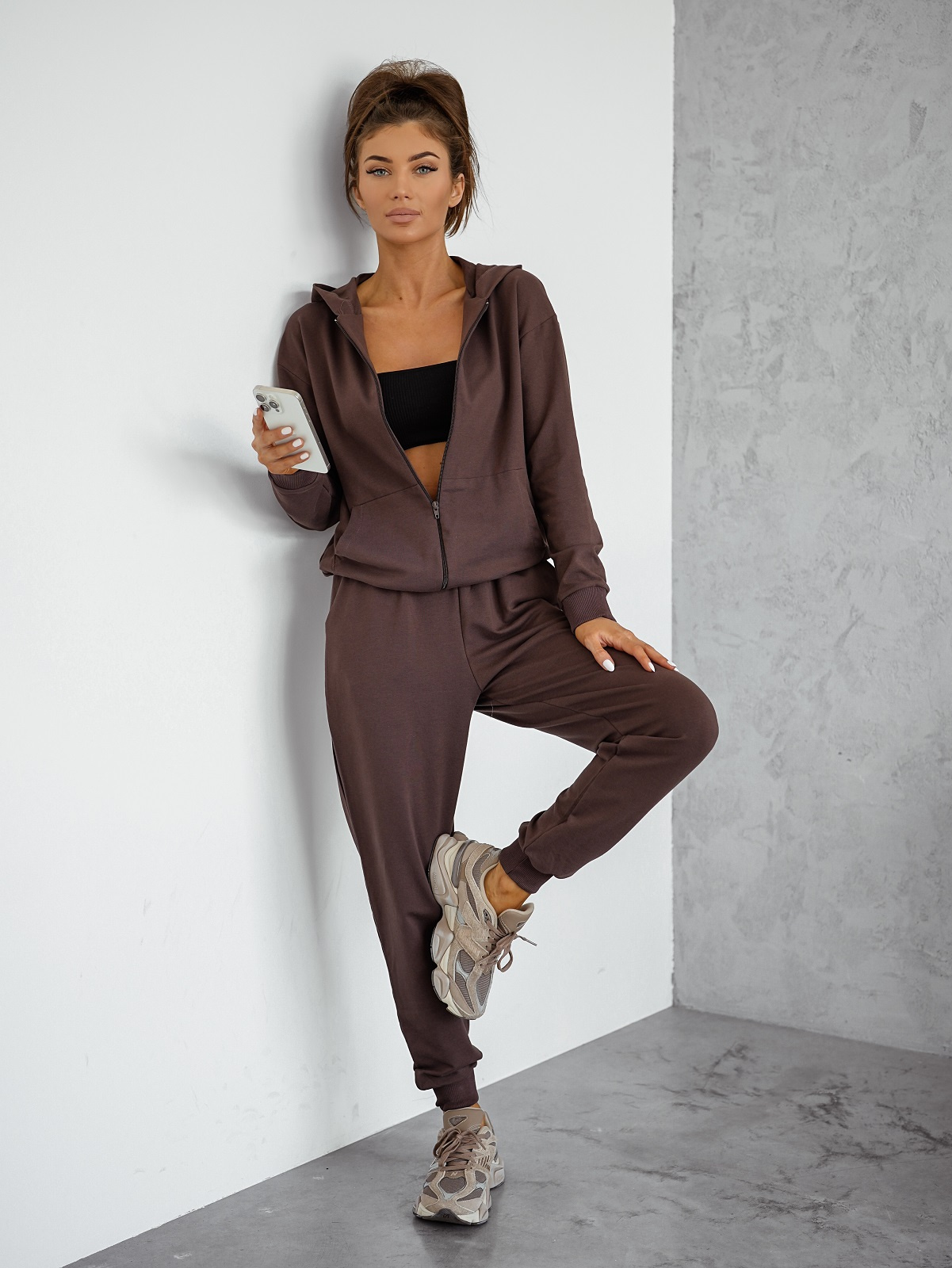 Damski komplet dresowy. Bluza z kapturem, zapinana na zamek. Spodnie zwężane, zakończone ściągaczami, posiadają praktyczne kieszenie na wysokości bioder oraz wygodną gumkę w pasie.