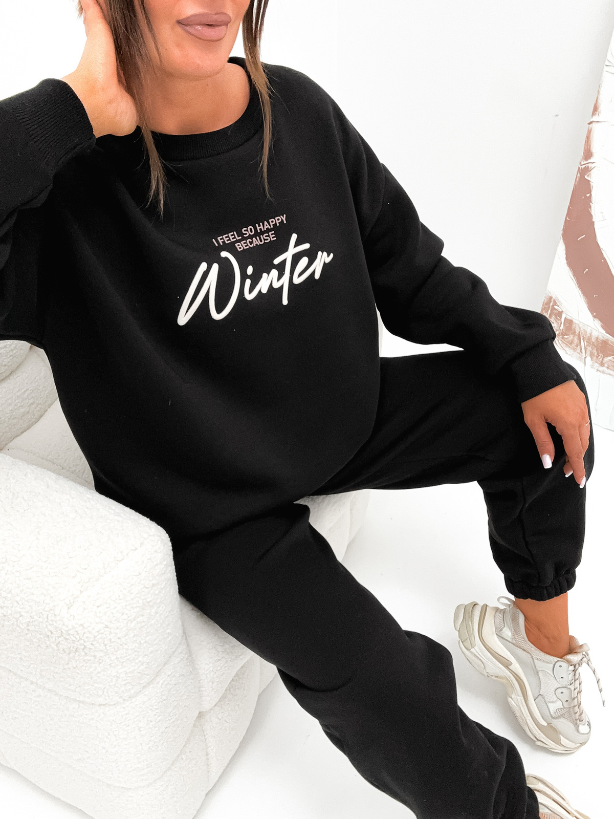 Bawełniany dres damski ocieplany. Luźniejszy krój. Bluza bez kaptura, z modnym napisem WINTER, doskonale pasuje do szerokich spodni zakończonych ściągaczem.
