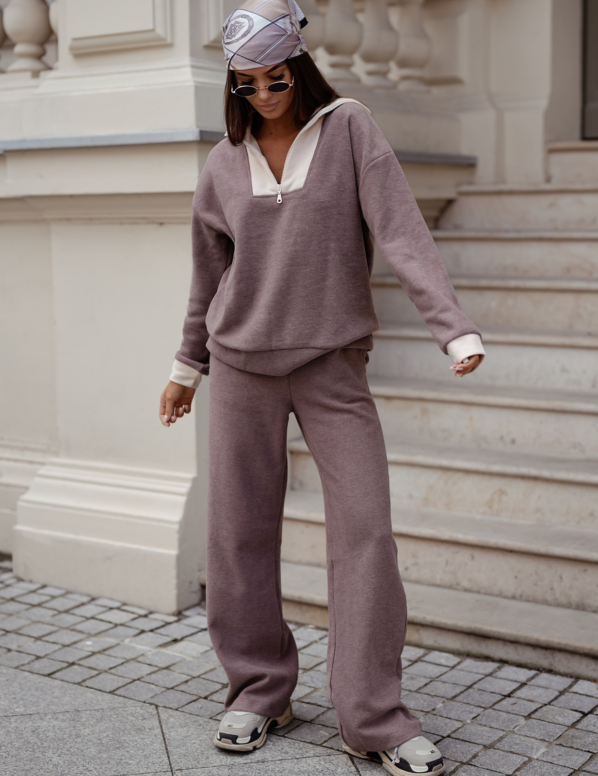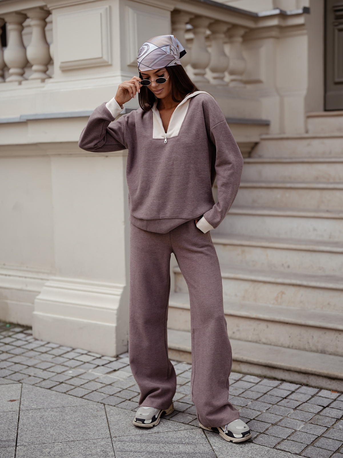 Damski komplet bawełniany. Bluza z wysokim golfem i suwakiem. Dwukolorowa, z modnym, kontrastowym wykończeniem w kolorze ecru na golfie oraz mankietach. Połączenie wygody i stylu. Szerokie spodnie z kieszeniami, zapewniające maksymalny komfort.