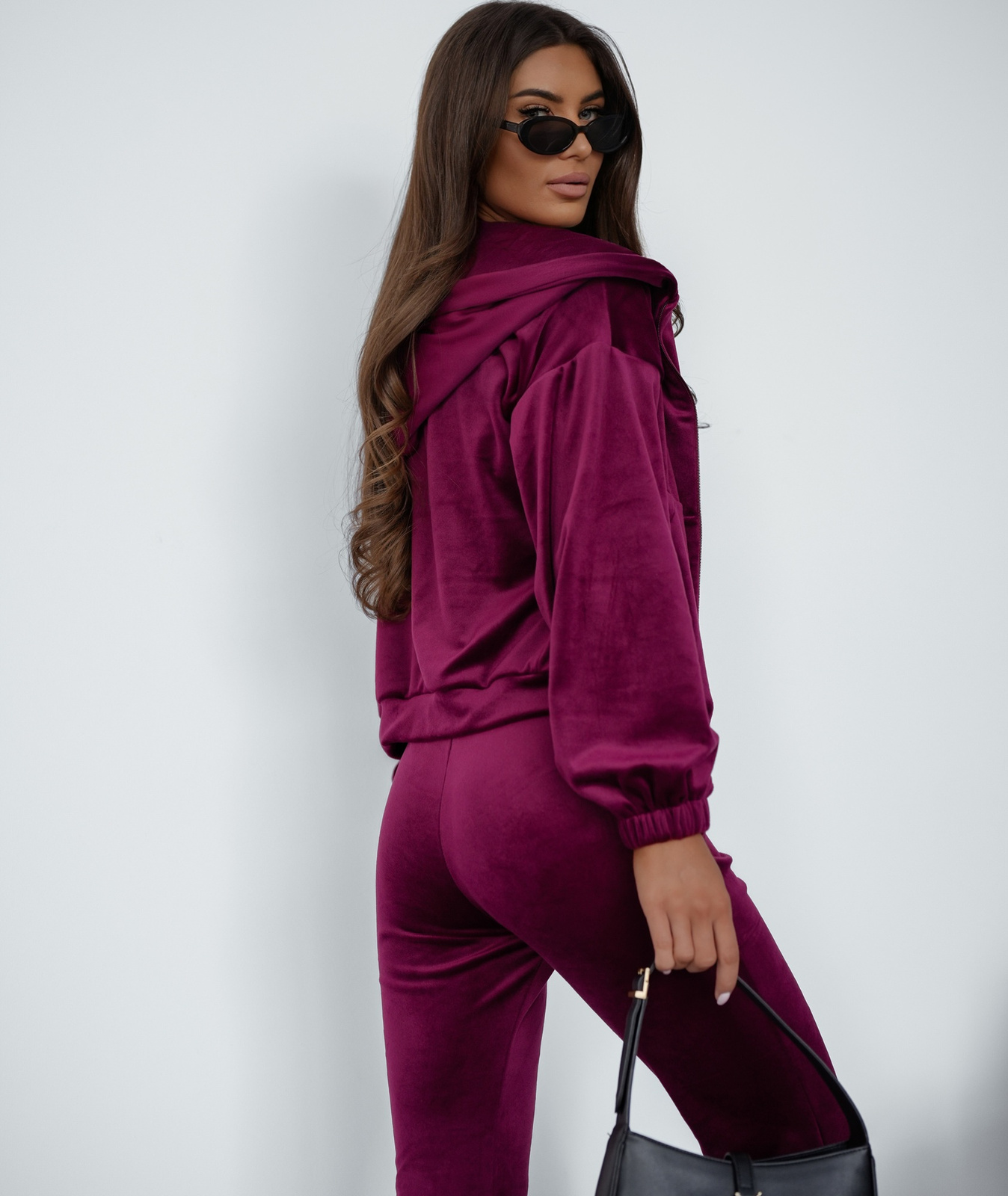 Dwuczęściowy komplet damski z miękkiego, elastycznego weluru. Bluza z wygodnym kapturem i kieszenią. Spodnie typu dzwony, które optycznie wydłużają nogi.