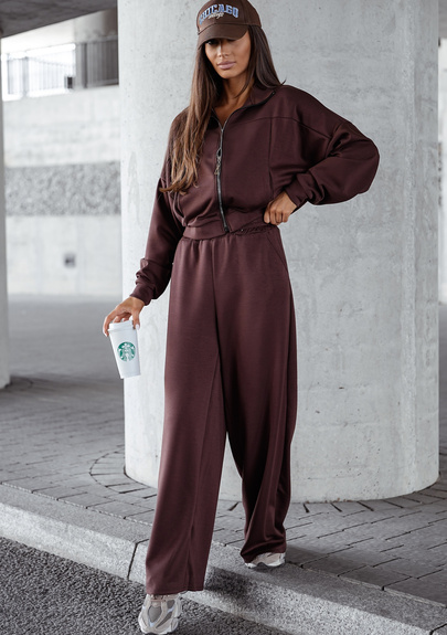 Damski dres wiskozowy wykonany z miękkiego i nie mechacącego się materiału. Bluza o kroju oversize bez kaptura, zapinana na zamek. Spodnie z szeroką nogawką posiadają wygodną gumkę w pasie oraz kieszenie na wysokości bioder.