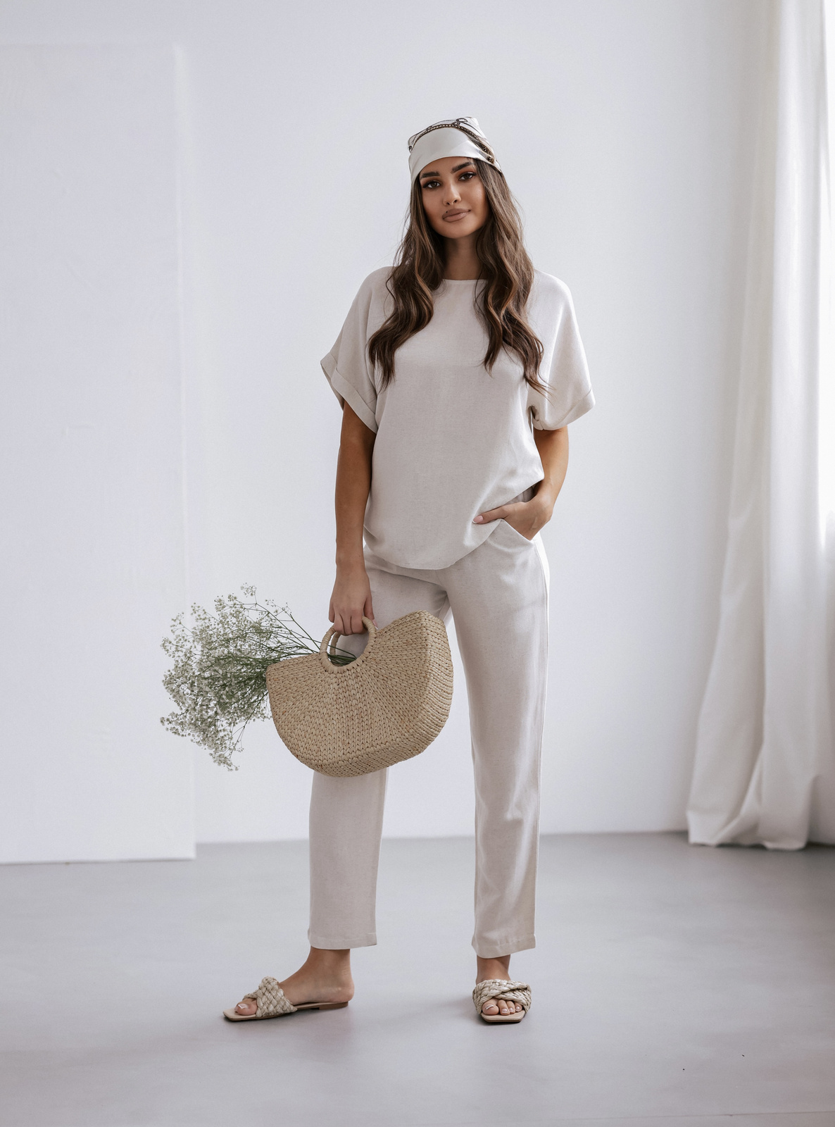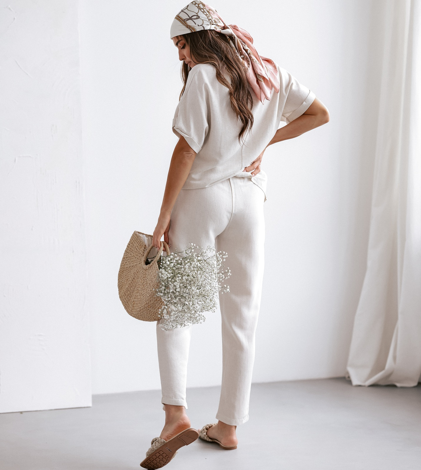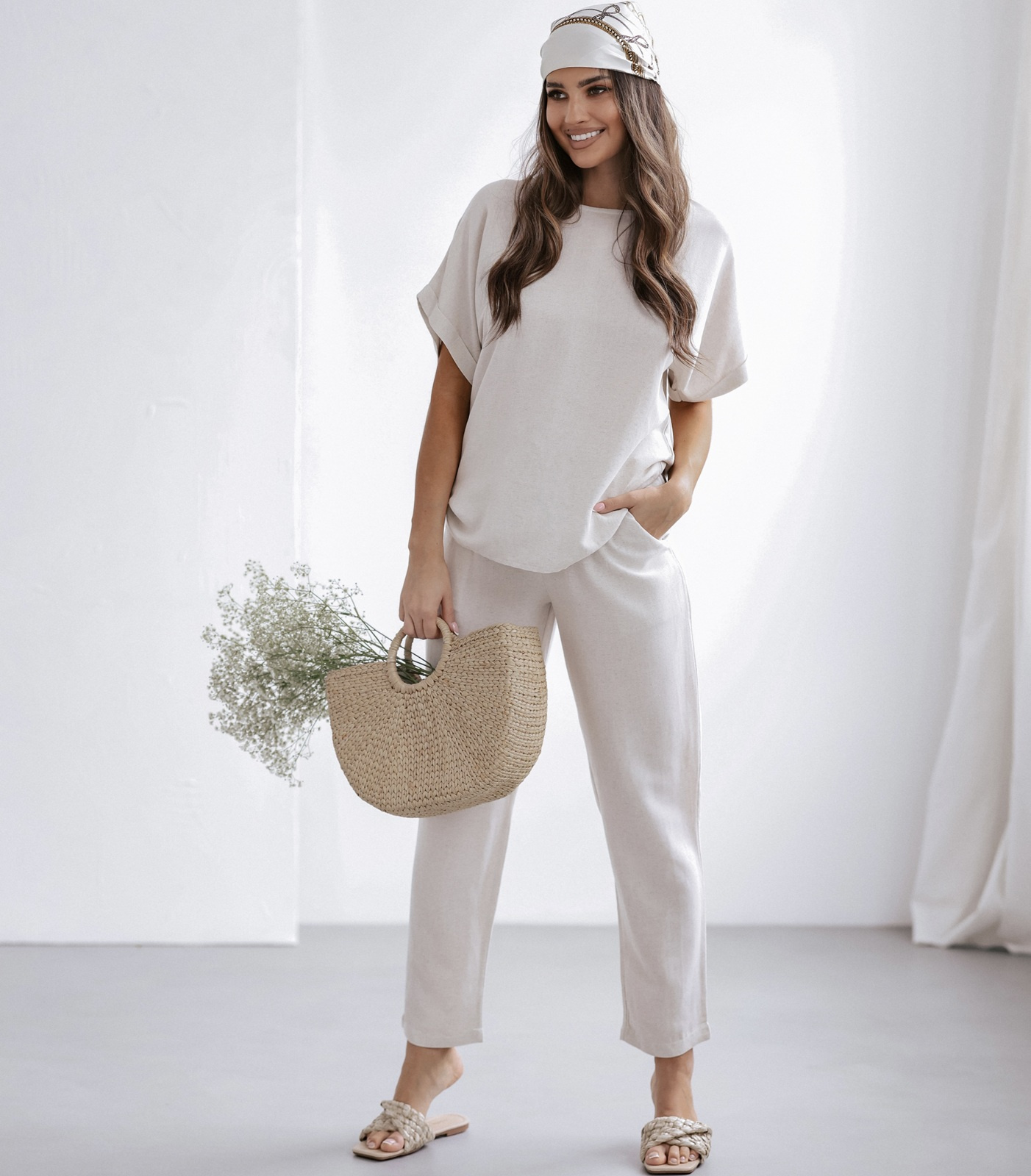 Lekki komplet z naturalnej mieszanki lnu, bawełny i wiskozy. Luźny t-shirt z modnie podwiniętymi rękawkami i subtelnym zapięciem na guzik z tyłu prezentuje się kobieco i swobodnie. Spodnie ze zwężanymi nogawkami, elastyczną talią i praktycznymi kieszeniami gwarantują wygodę przez cały dzień.