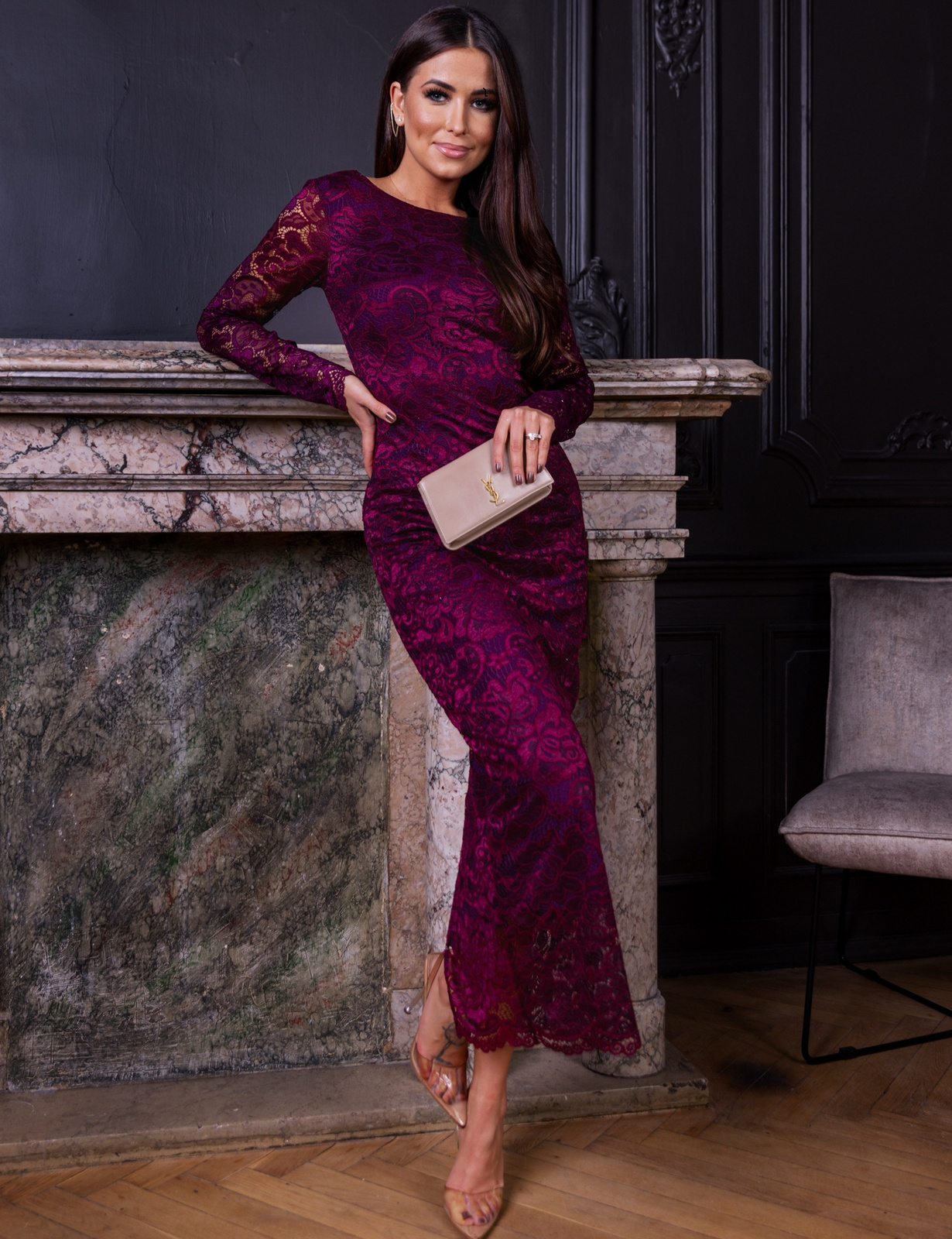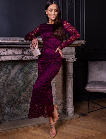 Długa sukienka wieczorowa wykonana z elastycznego, koronkowego materiału. Sukienka świetnie układa się na ciele. Bardzo elegancka z pewnością przykuje uwagę. Sukienka od szyi za linię kolan podszyta jest podszewką, więc ciało nie prześwituje. Długie rękawy przez swój ażurowy wzór odsłaniają subtelnie ciało. Dekolt okrągły, plecy delikatnie odsłonięte poprzez pogłębiony dekolt. W tylnej części sukienka posiada praktyczne i jednocześnie ponętne rozcięcie, które ułatwia chodzenie ale również dodaje pikanterii odsłaniając nogi.