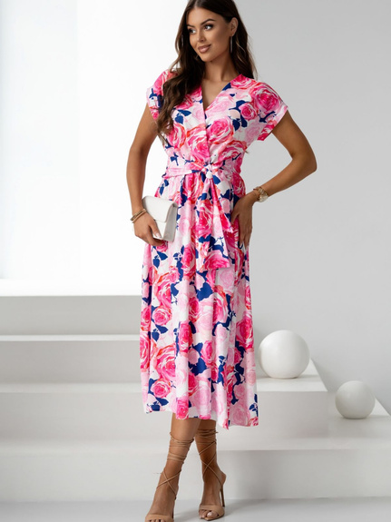 Damska sukienka midi z krótkimi rękawami i kopertowym dekoltem to kwintesencja kobiecości i lekkości. Ozdobiona wiosennym kwiatowym motywem, zachwyca zwiewnym fasonem i eleganckim wykończeniem, tworząc idealną stylizację na ciepłe, słoneczne dni.