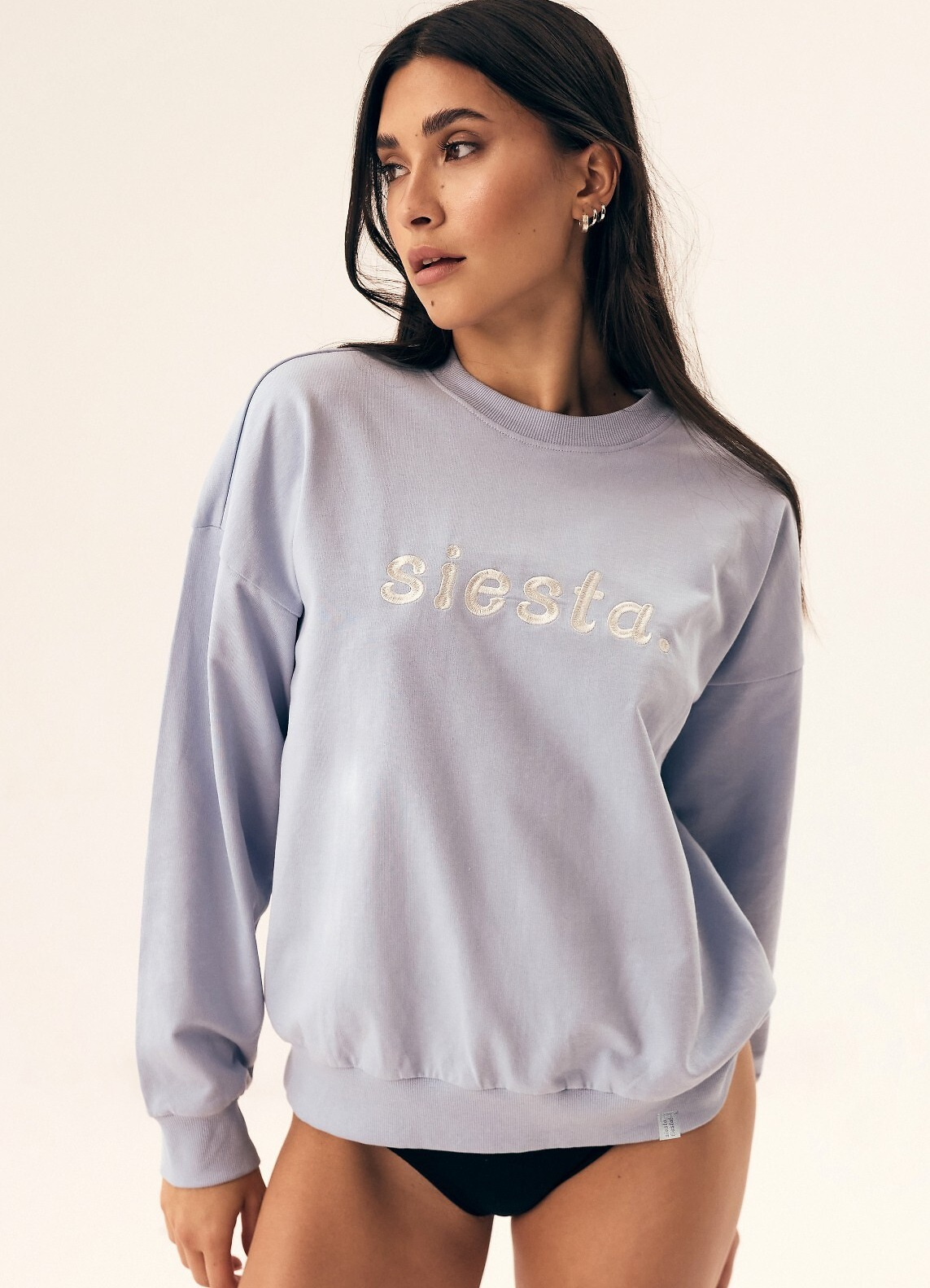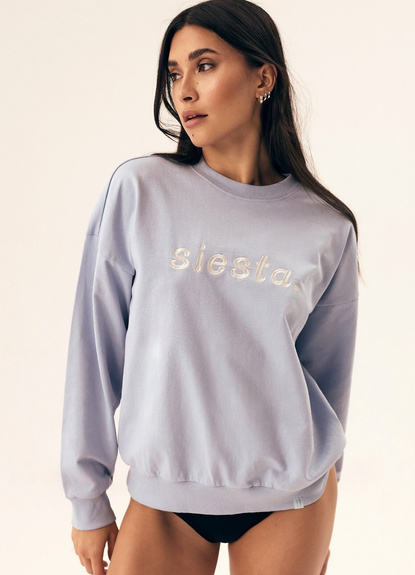 Bawełniana bluza damska o luźnym kroju. Wykonana z wysokiej jakości bawełny. Na przodzie haftowany napis "fiesta". Okrągły dekolt, mankiety oraz dół bluzy zakończone ściągaczem.
