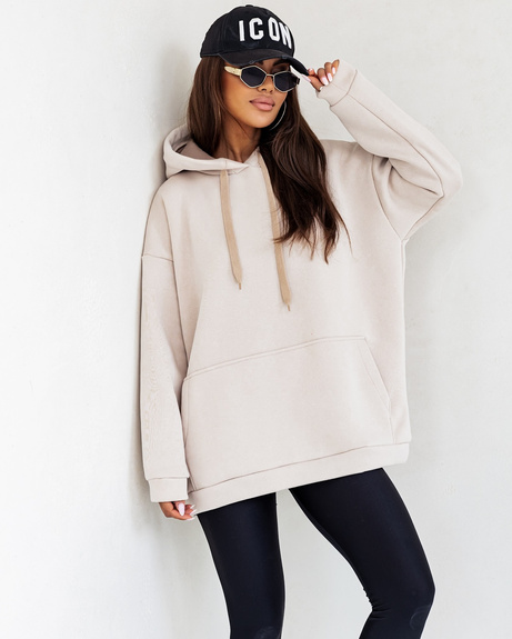 Ciepła i wygodna bawełniana bluza oversize. Wkładana przez głowę. Posiada kaptur ze ściągaczem. Dodatkowym atutem jest duża kieszeń z przodu.