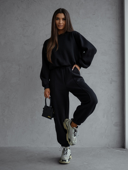 Wygodny damski dres wykonany z wysokiej jakości bawełny. Bluza bez kaptura, wkładana przez głowę. Dekolt okrągły. Rękawy oraz dół bluzy zakończony ściągaczem. Spodnie z wygodną gumką w pasie oraz praktycznymi kieszeniami, ozdobiony pionowymi przeszyciami. Nogawki zakończone ściągaczem.