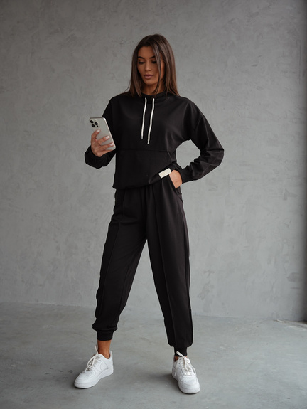 Dres bawełniany damski z klasyczną bluzą wkładaną przez głowę z luźną stójką oraz spodnie z wysokim stanem z kieszeniami po bokach to połączenie wygody i elegancji. Spodnie posiadają ściągacz w pasie z szeroką gumą oraz przeszyciem wzdłuż nogawki, co podkreśla klasyczny fason. Rozciągliwa bawełna doskonale układa się do sylwetki, gwarantując wygodę przez cały dzień.