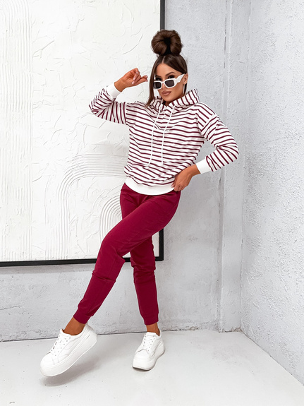 Dres damski bawełniany wykonany z wysokiej jakości bawełny. Bluza w paski z kapturem, wkładana przez głowę. Przy kapturze ozdobne troczki. Rękawy zakończone mankietem. Spodnie w jednolitym kolorze, z praktycznymi kieszeniami na wysokości bioder. Zakończone ściągaczem.