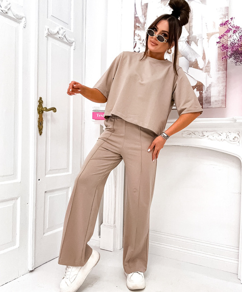 Wygodny komplet dresowy z miękkiej, elastycznej bawełny. Bluzka o kroju oversize z krótkimi rękawami i okrągłym dekoltem zapewnia swobodę ruchów. Szerokie spodnie z gumką w pasie oraz praktycznymi kieszeniami. Modne przeszycia na nogawkach podkreślają nowoczesny charakter dresu.