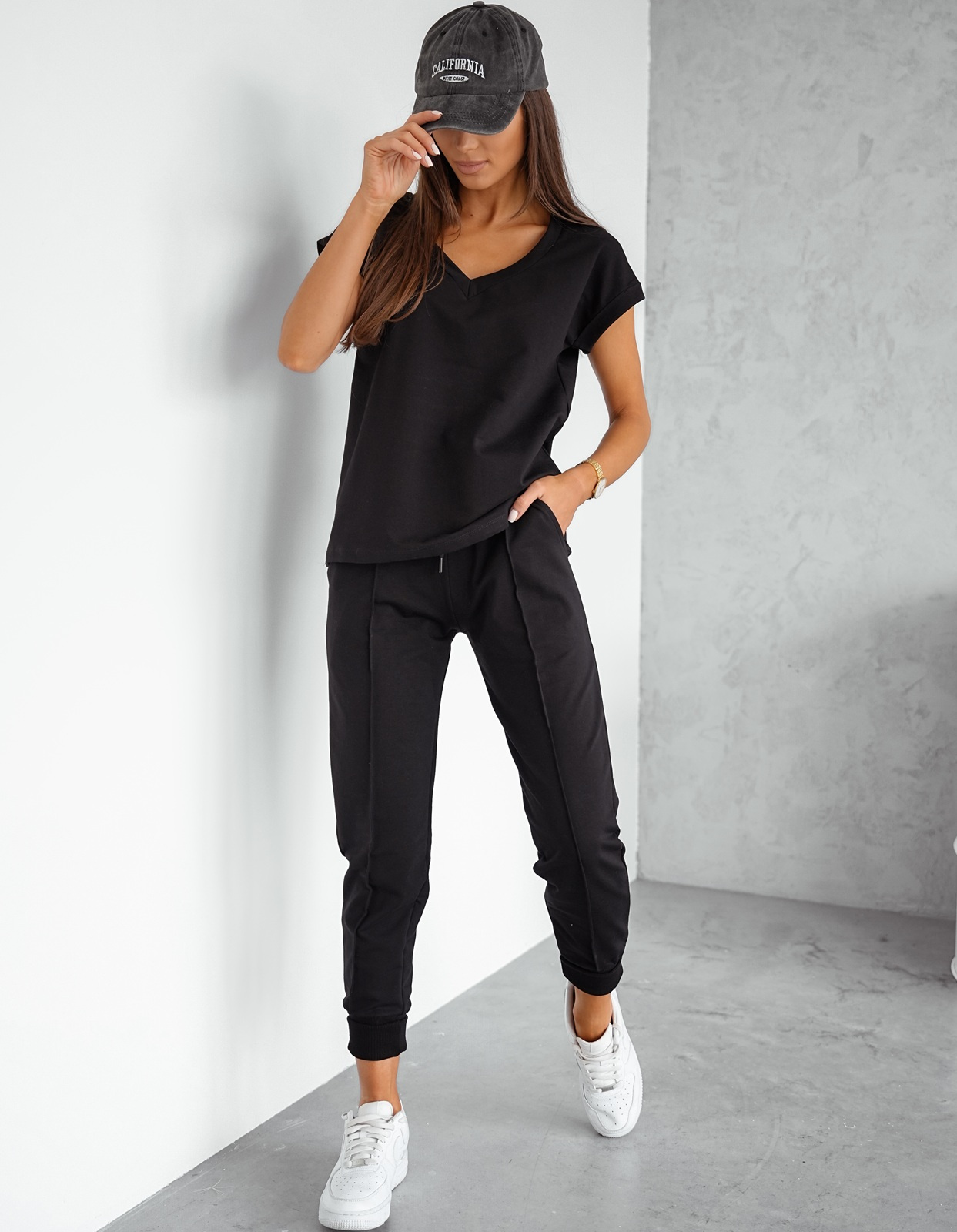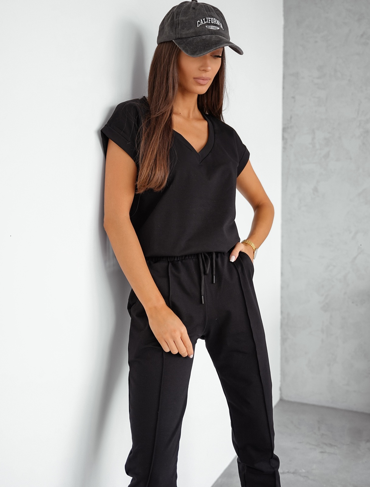 Komplet dresowy damski składający się z bluzki z krótkim rękawem i dekoltem w kształcie litery V oraz spodni w jednolitym kolorze. Idealnie wpisuje się w codzienny, swobodny styl. Kieszenie i elastyczna talia nadają kompletowi sportowego charakteru, a lekki, przyjemny w dotyku materiał zapewnia wygodę przez cały dzień.