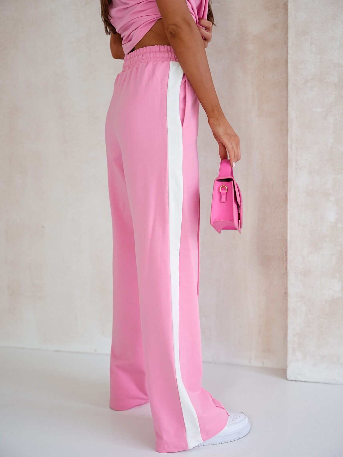 Komplet dresowy wykonany z wysokiej jakości bawełny. Koszulka z krótkimi rękawami zakończonymi białą lamówką, dekolt okrągły. Spodnie typu dzwony z lampasem, posiadają wygodną gumkę w pasie oraz praktyczne kieszenie na wysokości bioder.
