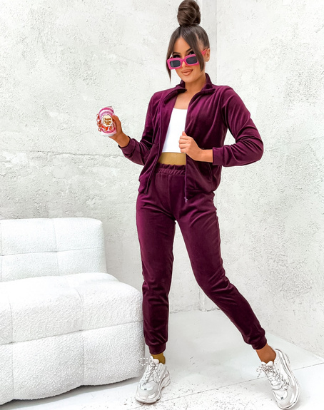 Klasyczny komplet dresowy w kolorze śliwkowym. Wykonany z miękkiego i przyjemnego w dotyku weluru. Bluza bez kaptura, zapinana na zamek, posiada dwie praktyczne kieszenie. Spodnie, gładkie z wygodną gumką w pasie, dwiema kieszeniami na wysokości bioder oraz ściągaczami przy nogawce.