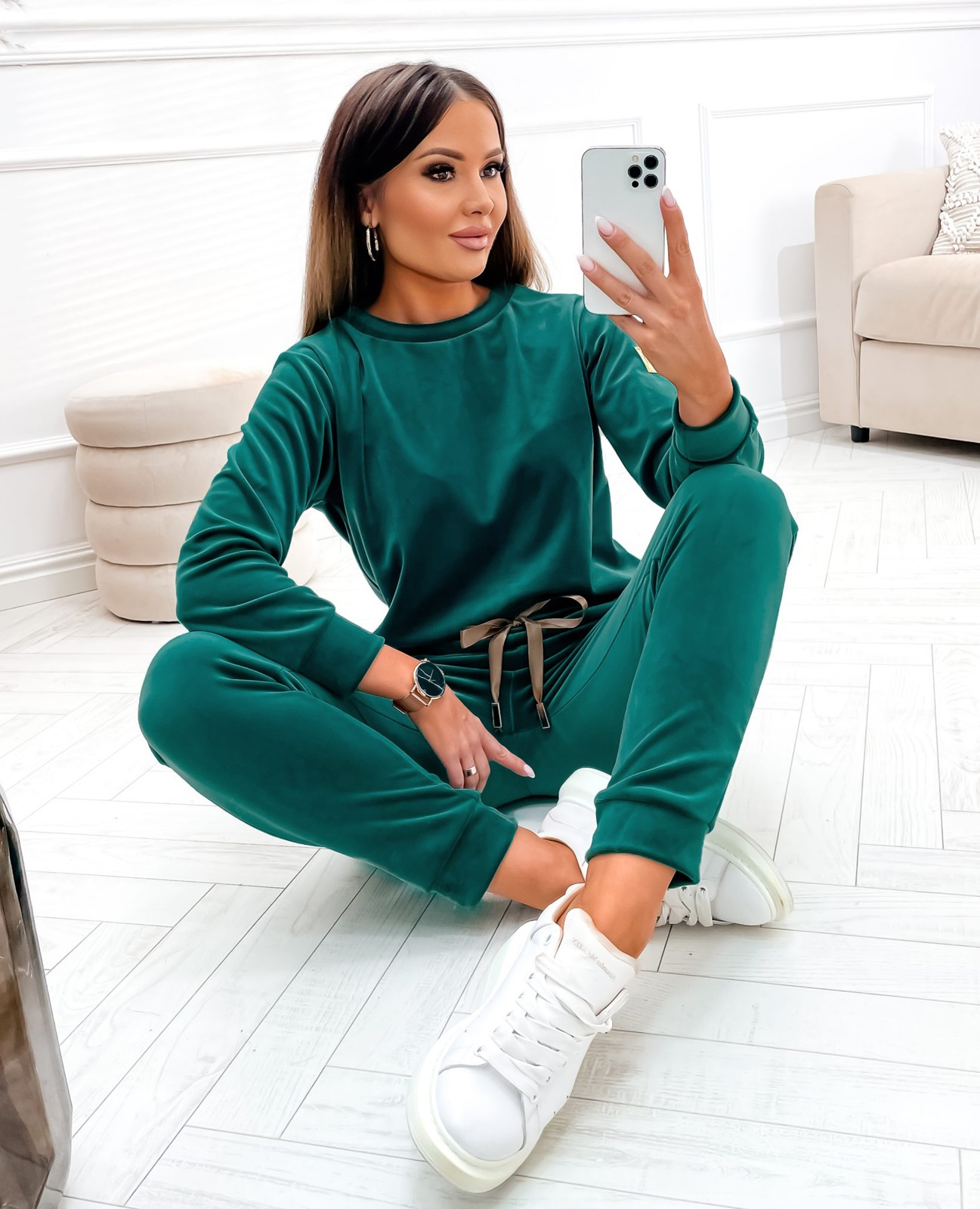 Klasyczny damski welurowy. Bluza wkładana przez głowę z okrągłym dekoltem, jej ramię zdobi delikatna naszywka. Spodnie, zwężane z wygodną gumą w pasie oraz ozdobną złotą wstążką.