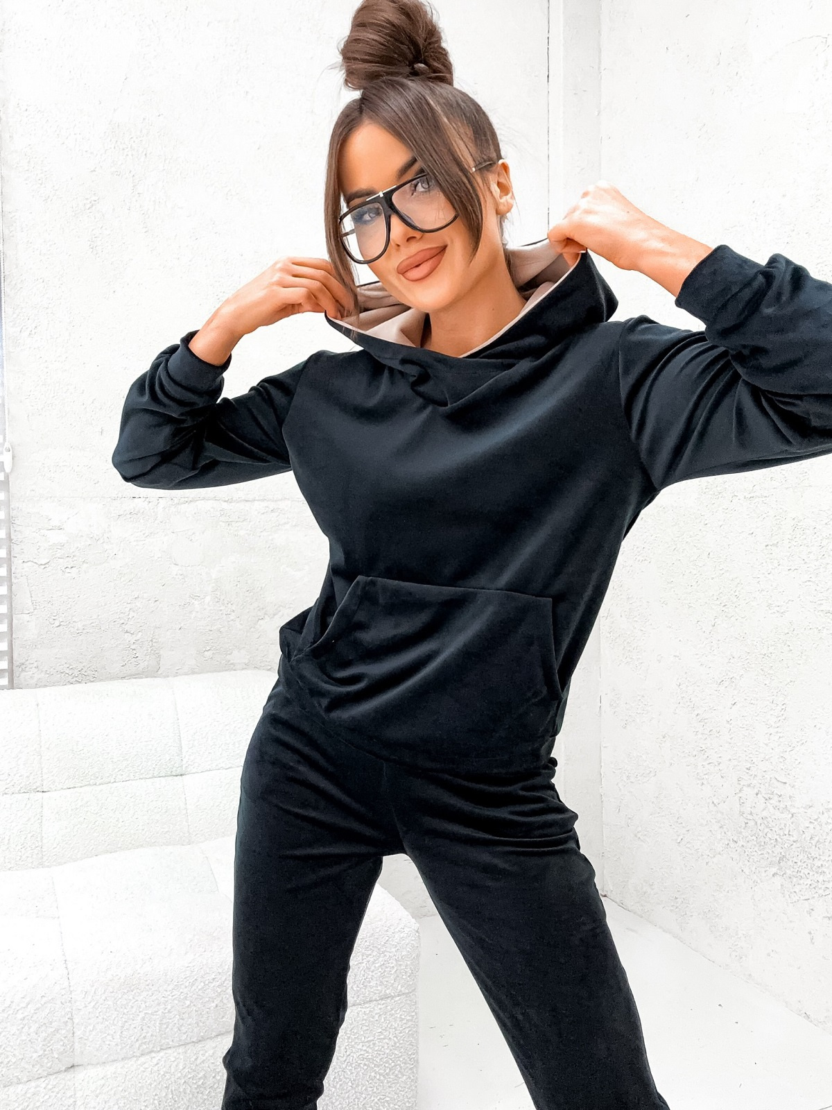 Welurowy komplet dresowy w kolorze czarnym. Spodnie z wygodną gumą w pasie i ściągaczem przy nogawce. Dwie praktyczne kieszenie po bokach. Bluza z kapturem z kontrastowym obszyciem w środku. Dół oraz rękawy zakończone ściągaczem.