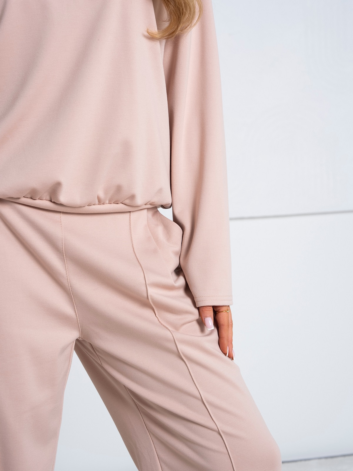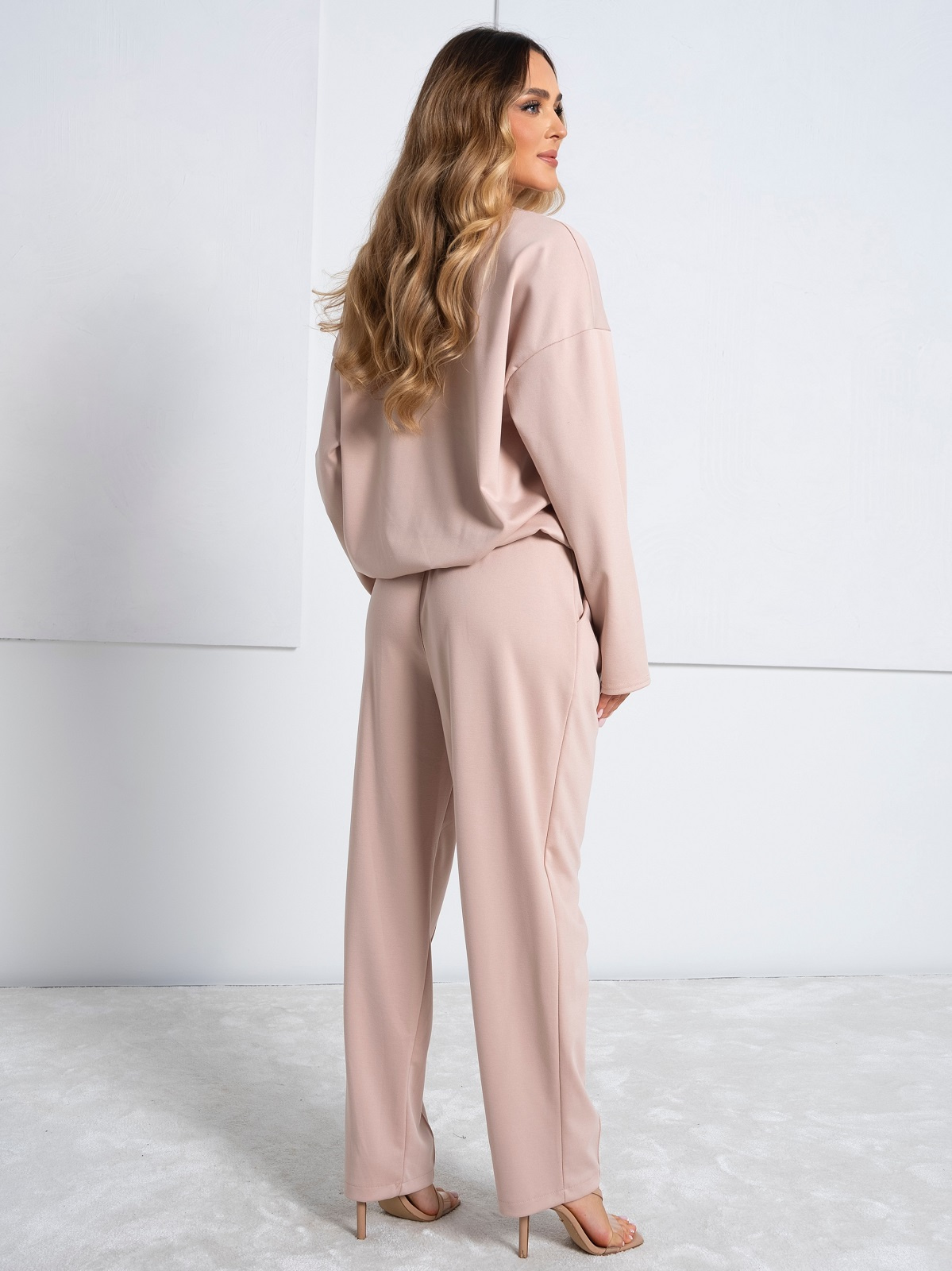 Komplet damski składający się z wygodnej bluzy o klasycznym kroju z okrągłym dekoltem w kolorze beżowym. Wygodne spodnie z szerokimi nogawkami z przeszyciem z przodu. Na wysokości bioder praktyczne kieszenie.
