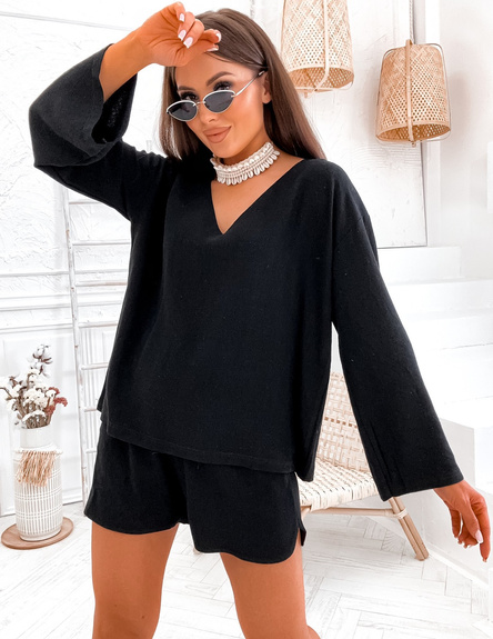 Przewiewny, oddychający komplet lniany w kolorze czarnym. Bluzka o luźnym kroju, wkładana przez głowę. Rękawy długie, rozkloszowane. Dekolt w kształcie litery "V". Krótkie spodenki w jednakowym kolorze, z wygodną gumką w pasie.