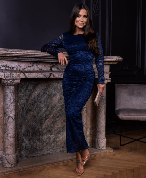 Długa sukienka wieczorowa wykonana z elastycznego, koronkowego materiału. Sukienka świetnie układa się na ciele. Bardzo elegancka z pewnością przykuje uwagę. Sukienka od szyi za linię kolan podszyta jest podszewką, więc ciało nie prześwituje. Długie rękawy przez swój ażurowy wzór odsłaniają subtelnie ciało. Dekolt okrągły, plecy delikatnie odsłonięte poprzez pogłębiony dekolt. W tylnej części sukienka posiada praktyczne i jednocześnie ponętne rozcięcie, które ułatwia chodzenie ale również dodaje pikanterii odsłaniając nogi.