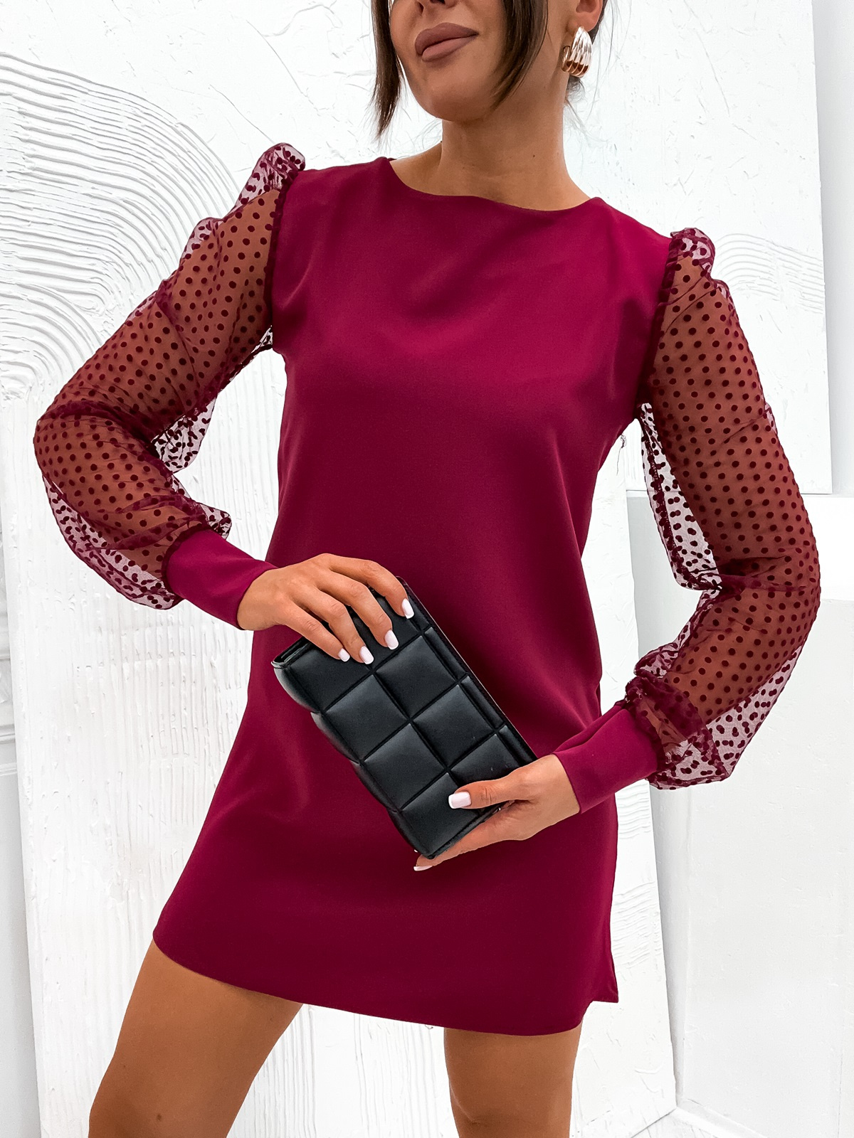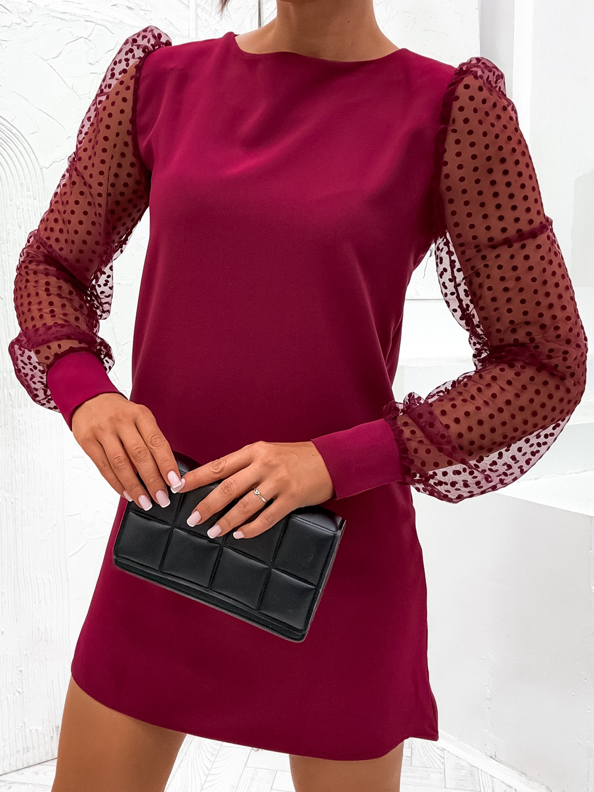 Sukienka Polskiej produkcji, uszyta została z bardzo eleganckiej, gładkiej, jednolitej tkaniny. Rękawy wykonane zostały z luźnego, przezroczystego tiulu w groszki. Elegancki styl i prosta forma sprawdzi się na każdą okazję.