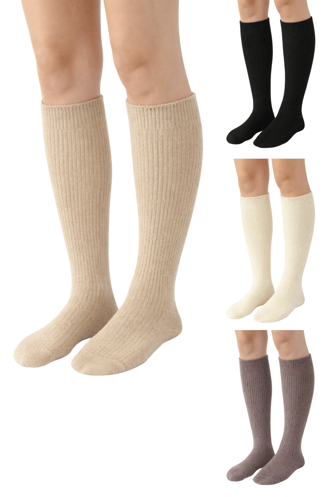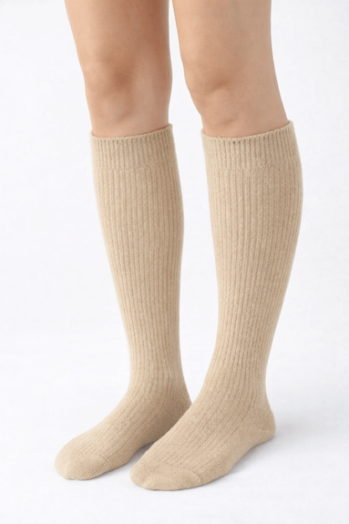 Podkolanówki damskie z wełny alpaki. Delikatny prążek po całości. Klasyczny, beżowy kolor. Dobrze trzymają się na nodze. Ciepłe, wygodne podkolanówki.