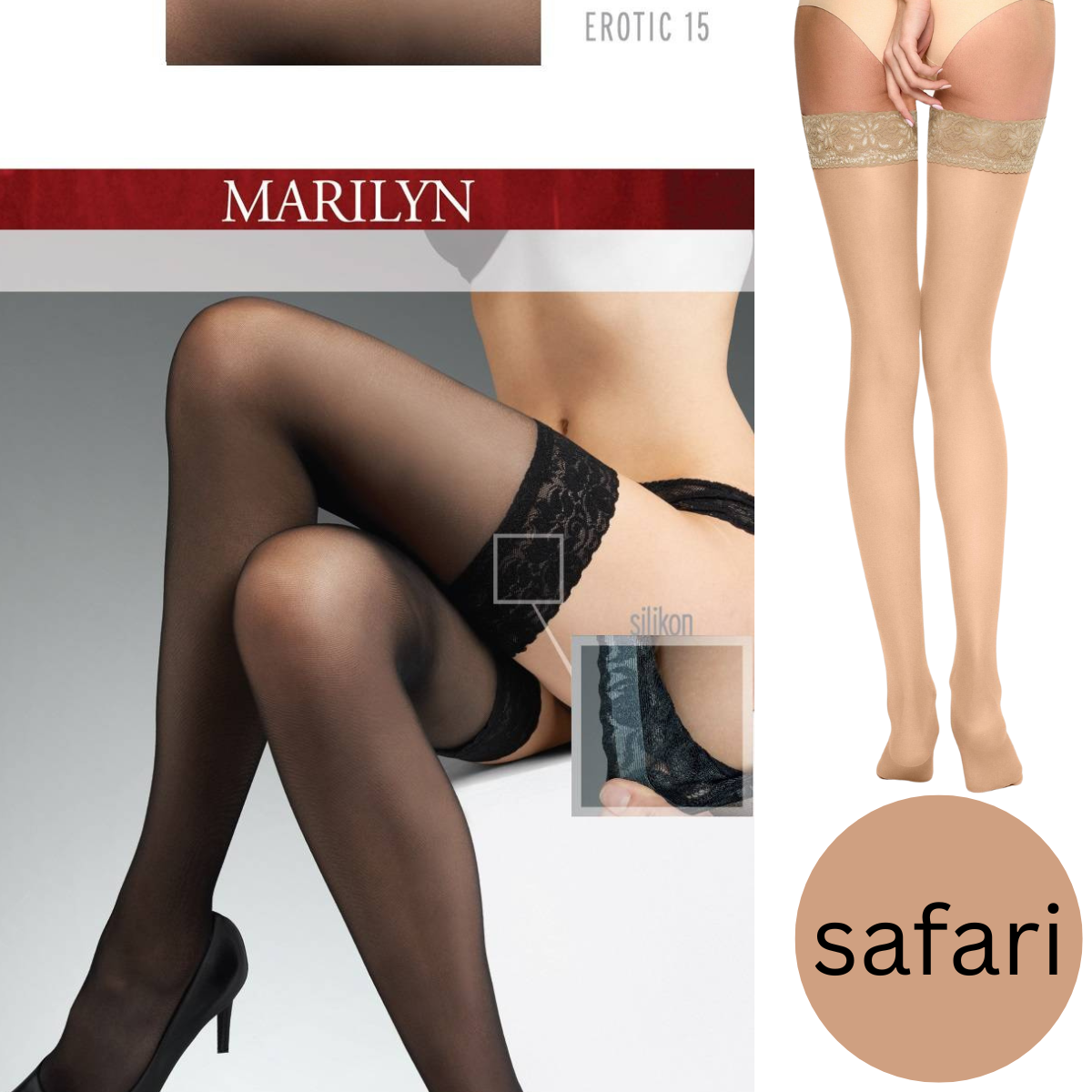 Pończochy EROTIC z Lycry 15 DEN półmatowe. Elastyczne i trwałe. Wykończone elegancką koronką z silikonem zapobiegającym zsuwaniu. Niezbędne w Twojej szafie niezależnie od zmieniających się trendów.