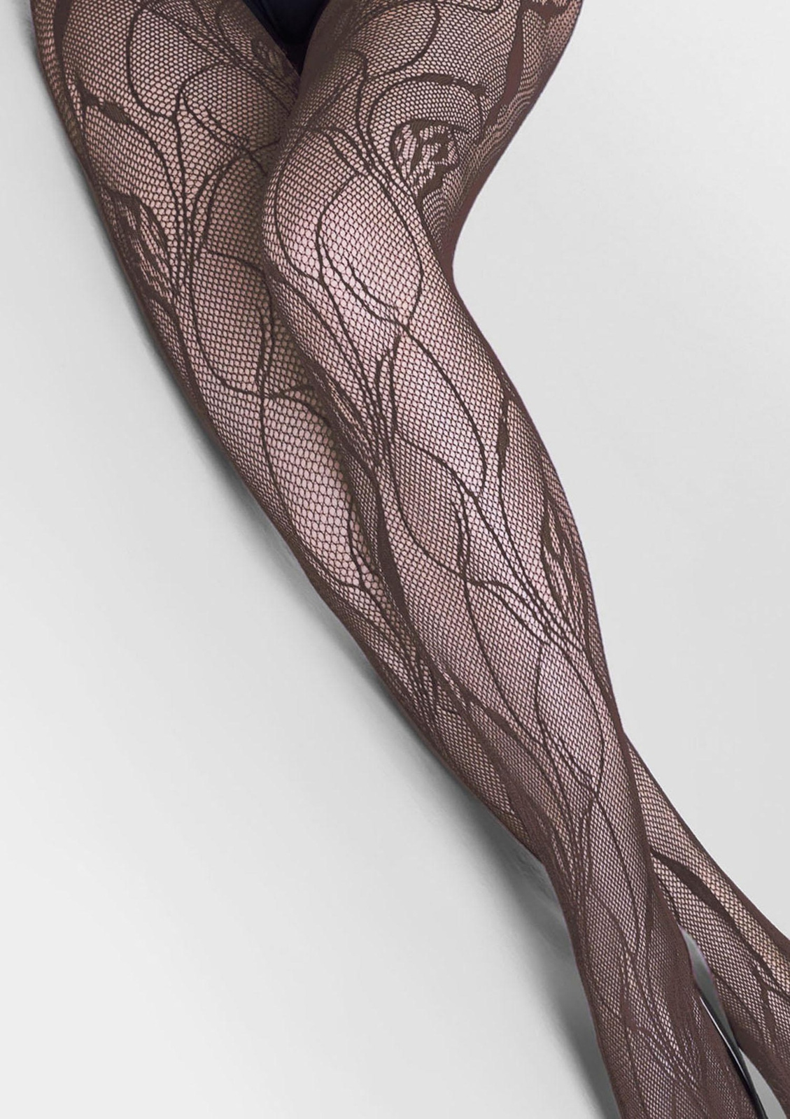 Rajstopy kabaretki o drobnym splocie z dekoracyjnym, kwiatowym wzorem na całej długości, który podkreśla linię nóg