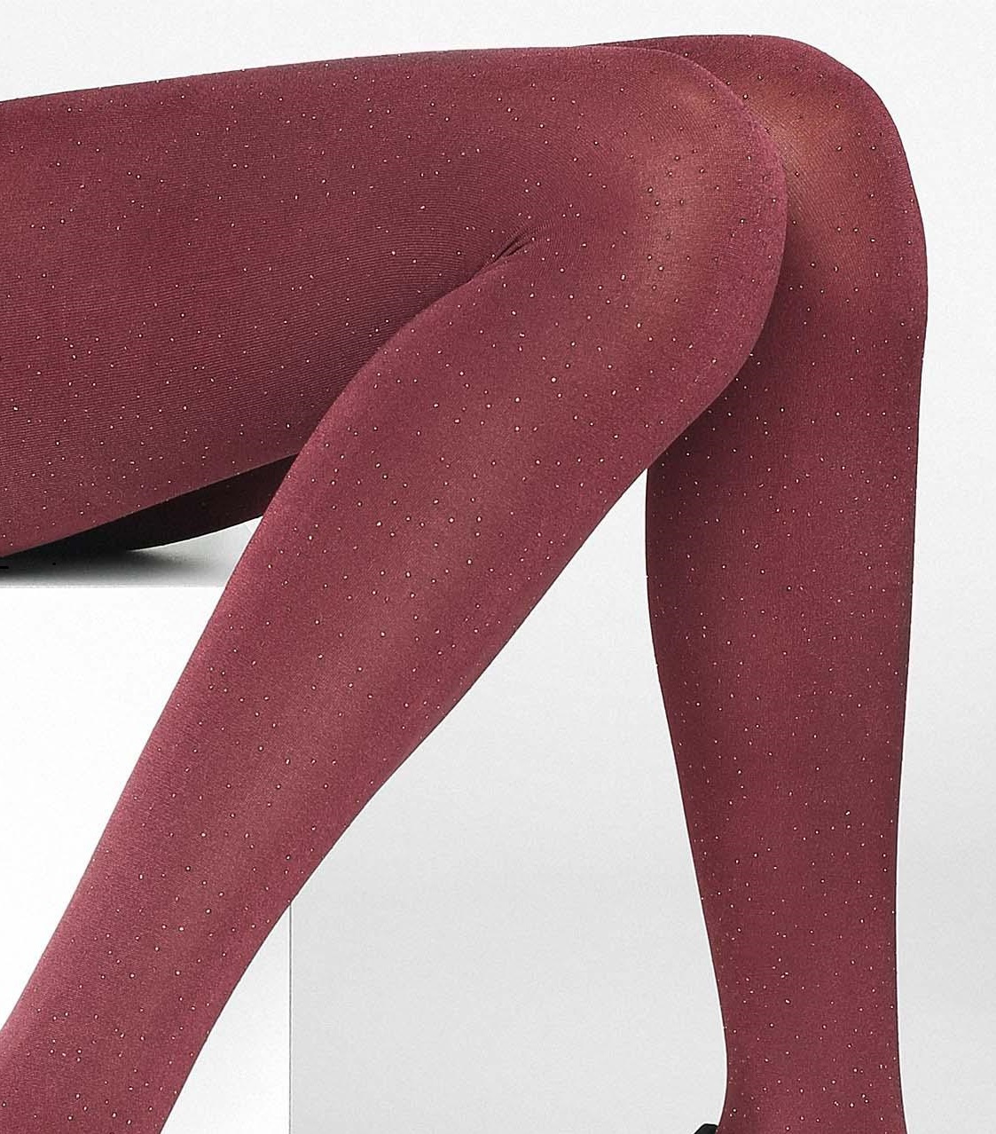 Rajstopy o grubości 100 den z subtelnymi drobinkami otulające nogi jedwabną poświatą. Posiadają wygodną gumkę w pasie, płaski szew, mały bawełniany klin oraz niewidoczne wzmocnienie palców.