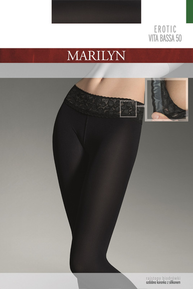 Rajstopy o grubości 50 den o obniżonej talii (biodrówki), wykończone ozdobną koronką z silikonem. Elastyczne, półmatowe z małym bawełnianym klinem. Rajstopy Erotic Vita Bassa 50den są bezmajtkowe, z niewidocznym wzmocnieniem palców. Wszystkie rozmiary mają pojedynczy szew z tyłu.