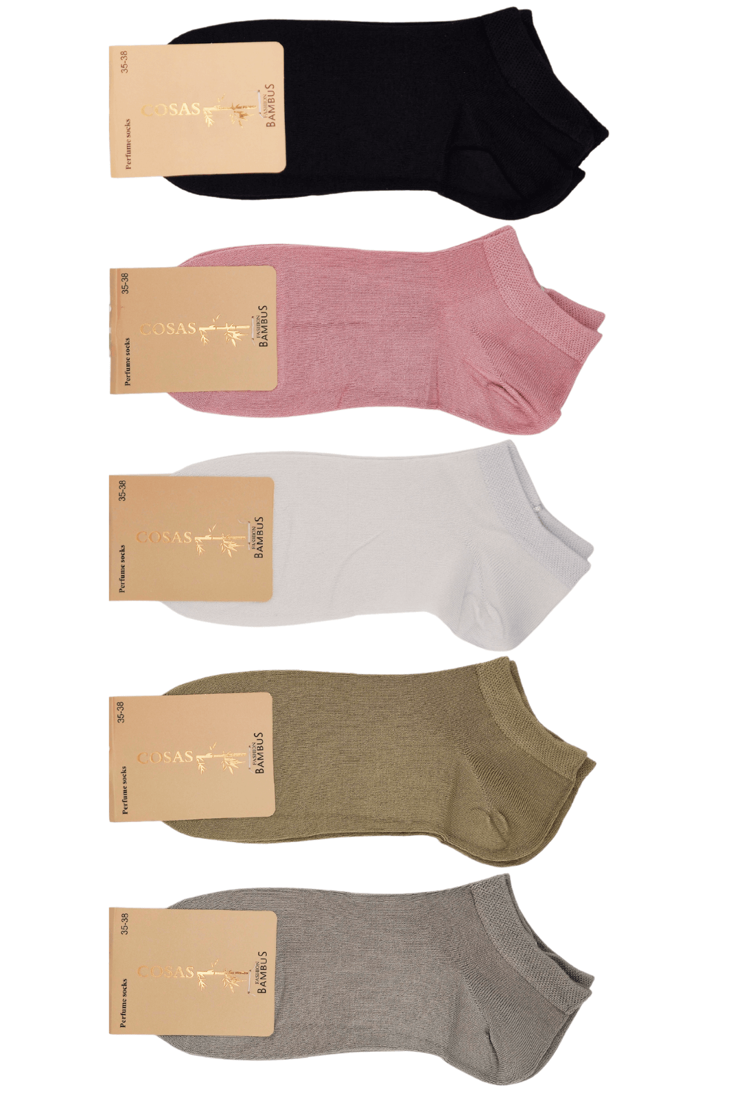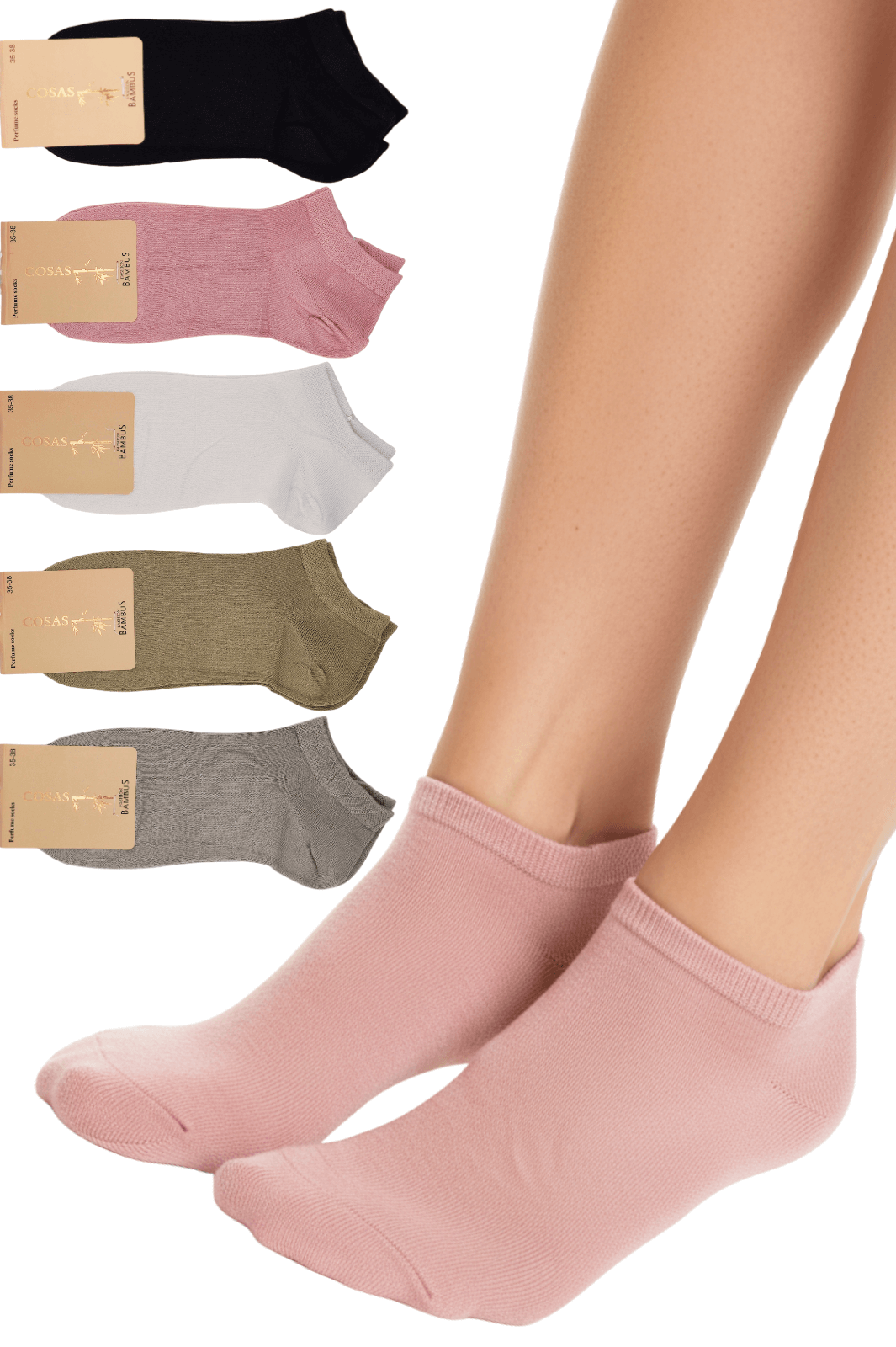 Klasyczne stopki damskie wykonane z włókna bambusowego. Pakowane w zestaw 5 par. Kolory: biały, czarny, różowy, beżowy, szary.