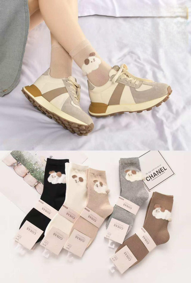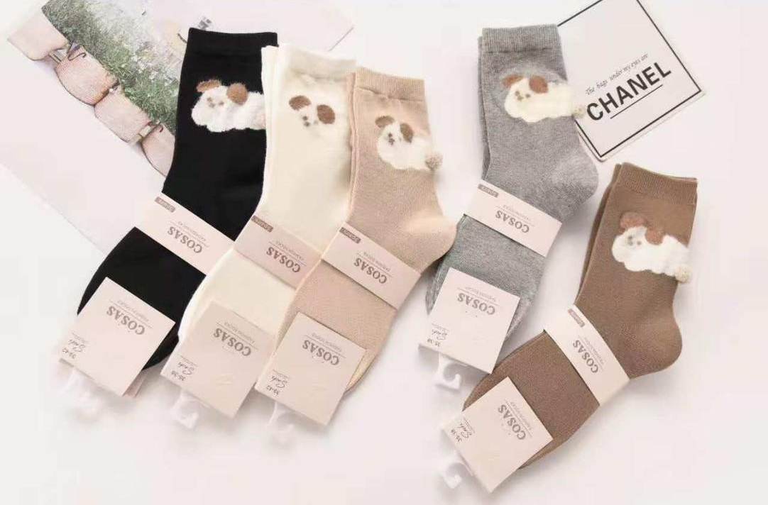 Bawełniane skarpetki damskie z ozdobnym pomponikiem u nogawki. Pakowane po 5 par.