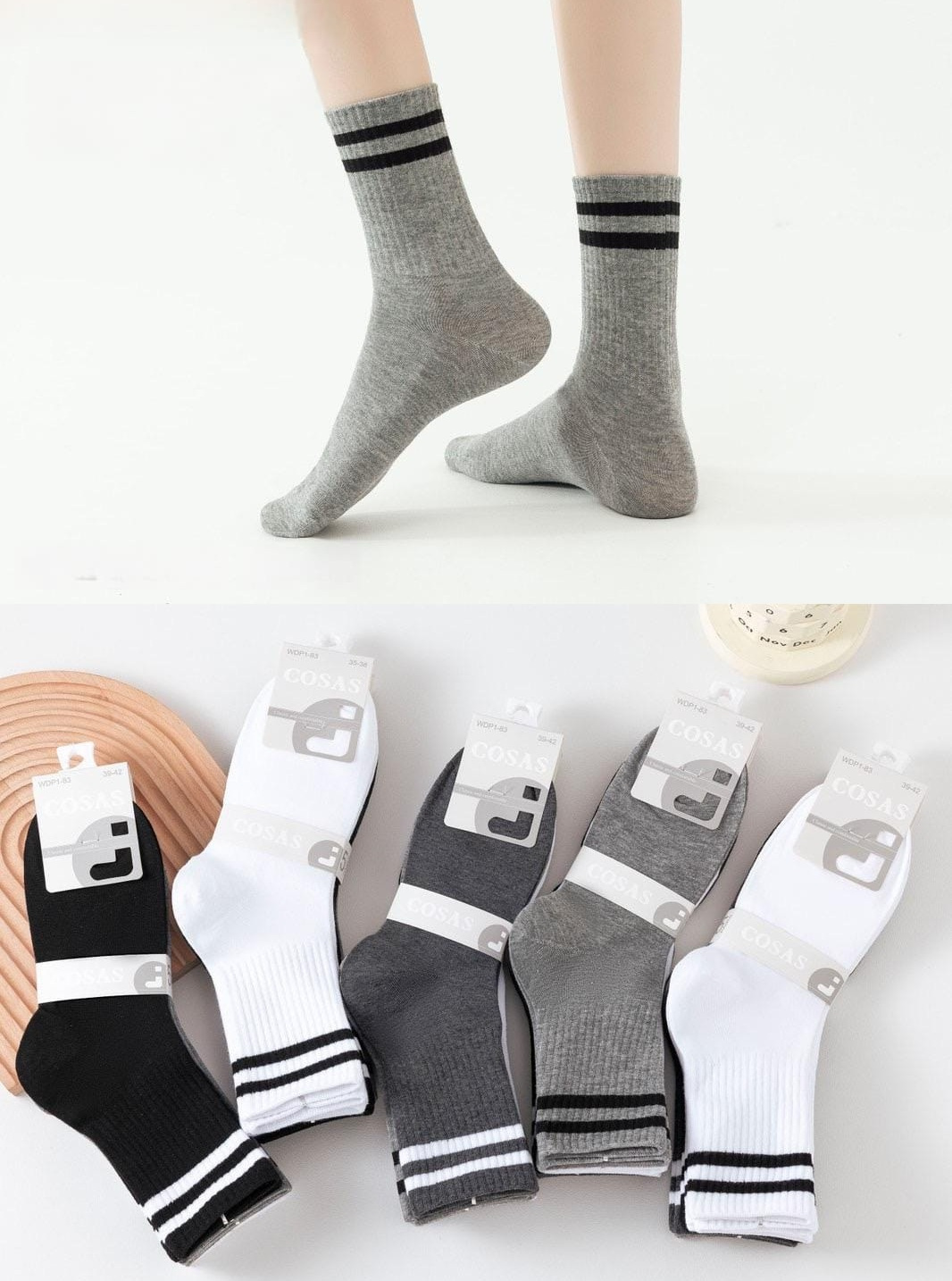 Sportowe skarpetki damskie o średniej długości. W górnej częsci dwa ozdobne paski. Pakowane po 5 par, w mixie kolorów.
