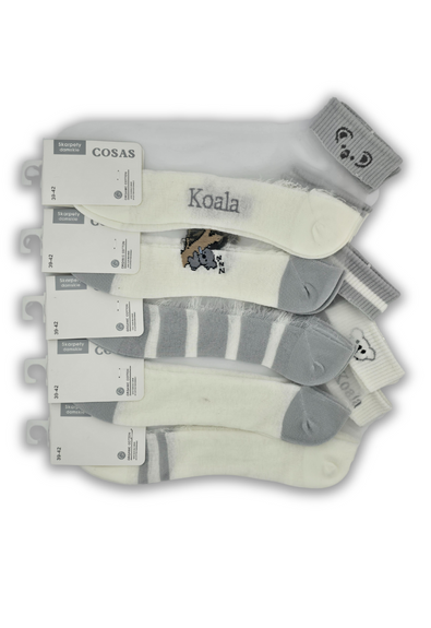 Skarpetki damskie z wstawkami z przezroczystego tiulu. Delikatne, oddychające i stylowe. Pakowane po 5 par, w mixie wzorów w urocze koale.