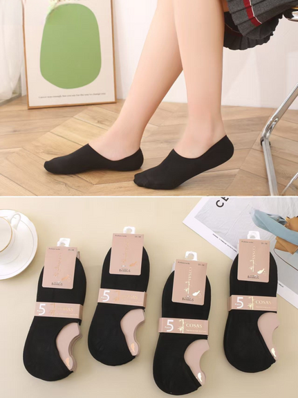 Skarpetki damskie typu stopki. Posiadają silikon na pięcie zapobiegający zsuwaniu się podczas noszenia. Pakowane po 5 par, wszystkie w kolorze czarnym.