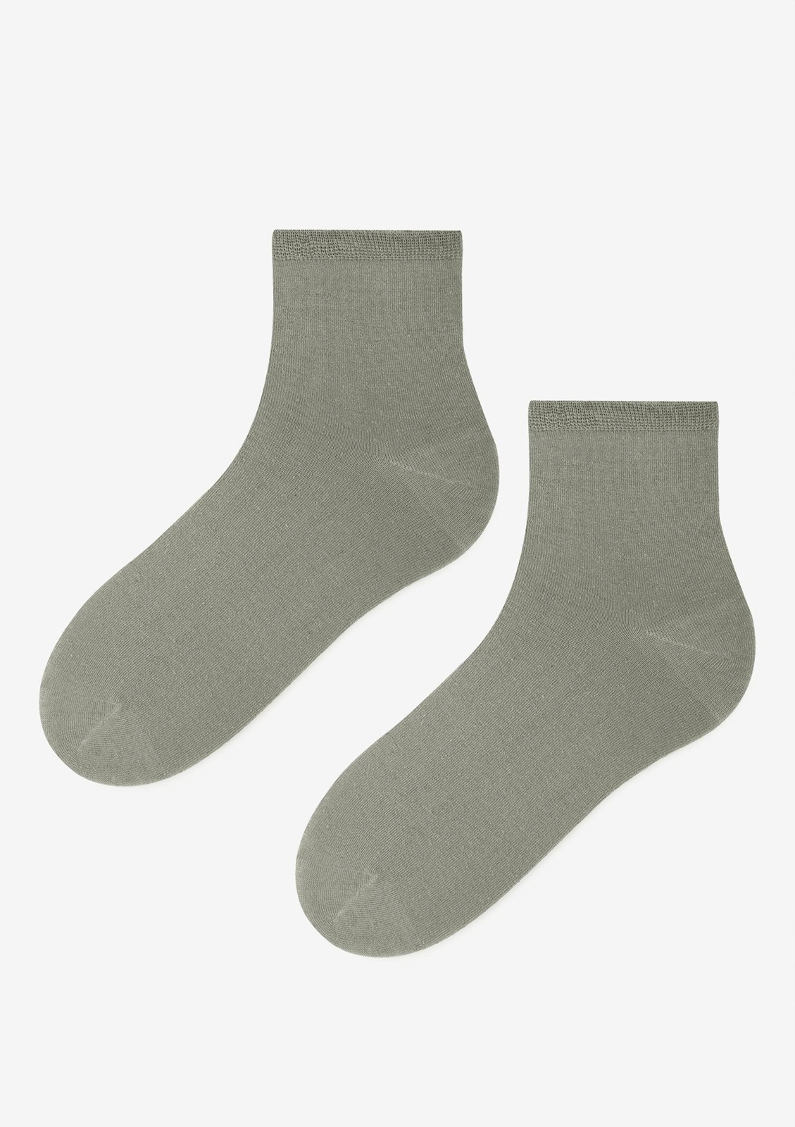 Komfortowe skarpetki damskie o klasycznej długości zakończone nieuciskającym ściągaczem. Wykonane z wysokogatunkowych materiałów wiskozy i lnu. Pakowane pojedynczo. Kolor oliwkowy.