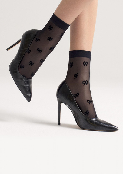 Cienkie skarpetki damskie w kokardki. W kolorze czarnym. Elastyczne, przylegające do stopy. Zapobiegające obtarciom.