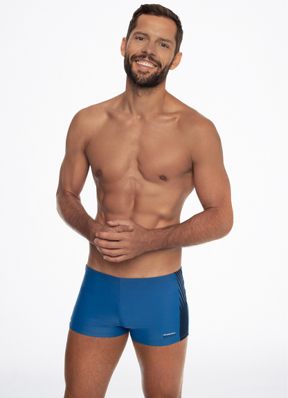 Bokserki kąpielowe męskie w kolorze niebiesko-czarnym. Na nogawce minimalistyczne napis. Od wewnętrznej strony wszyta siateczka. Posiadają elastyczny pas ze sznurkiem do regulacji.